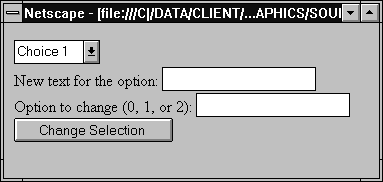 <SELECT NAME="musicType">Example 2. In the following form, the user can enter some text in the first text field and then enter a number between 0 and 2 (inclusive) in the second text field. When the user clicks the button, the text is substituted for the indicated option number and that option is selected.